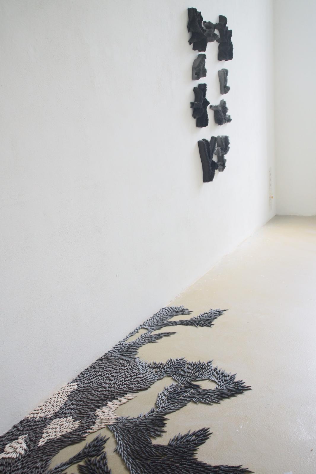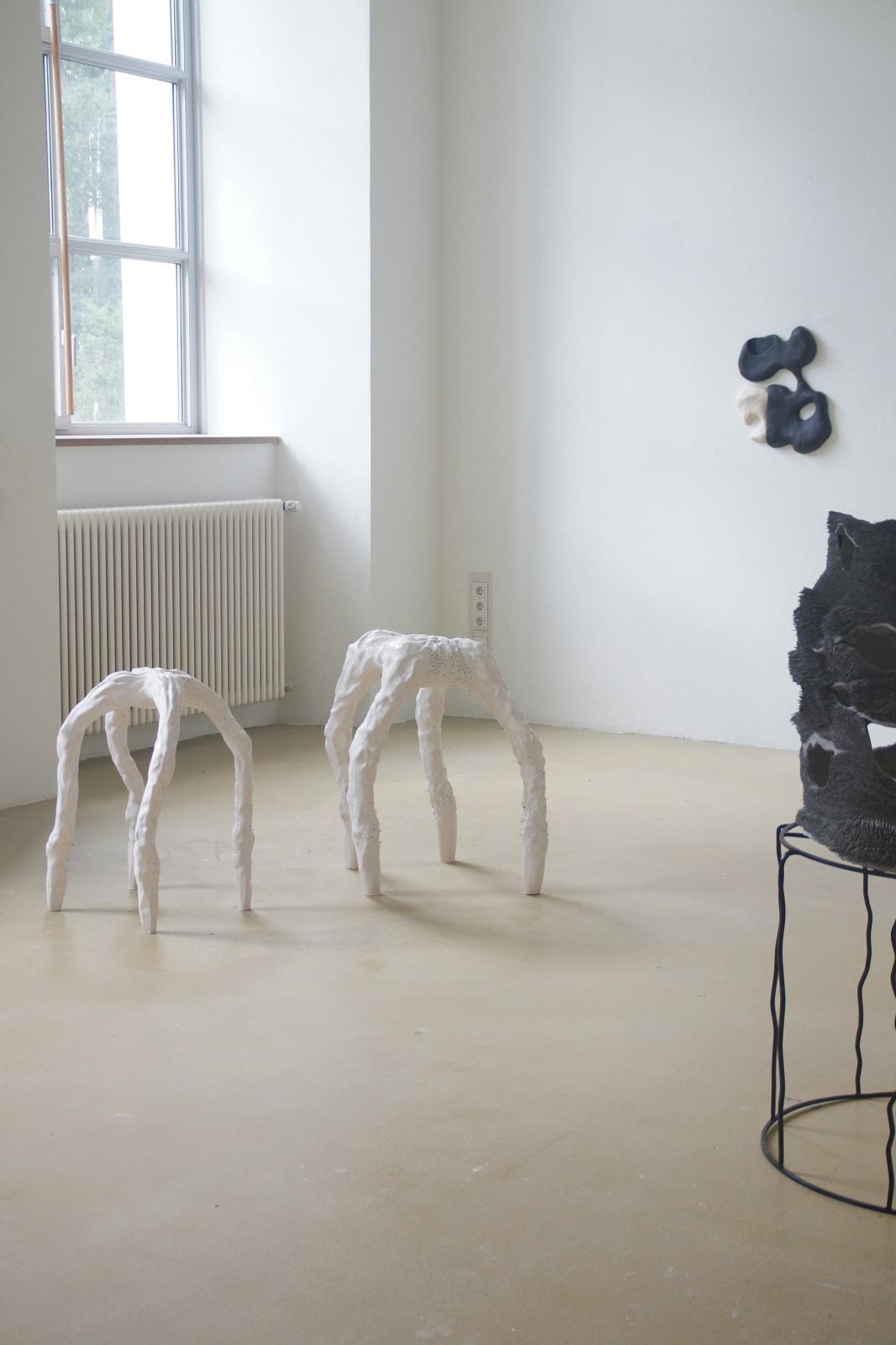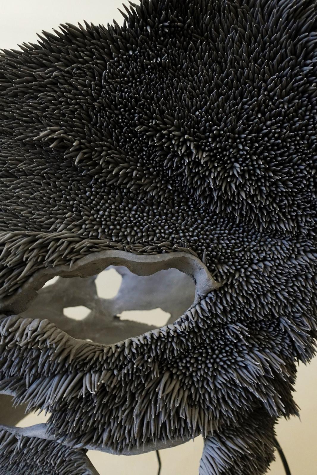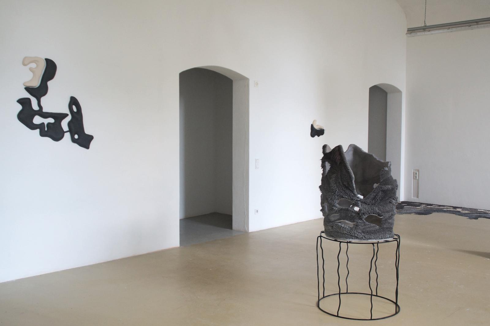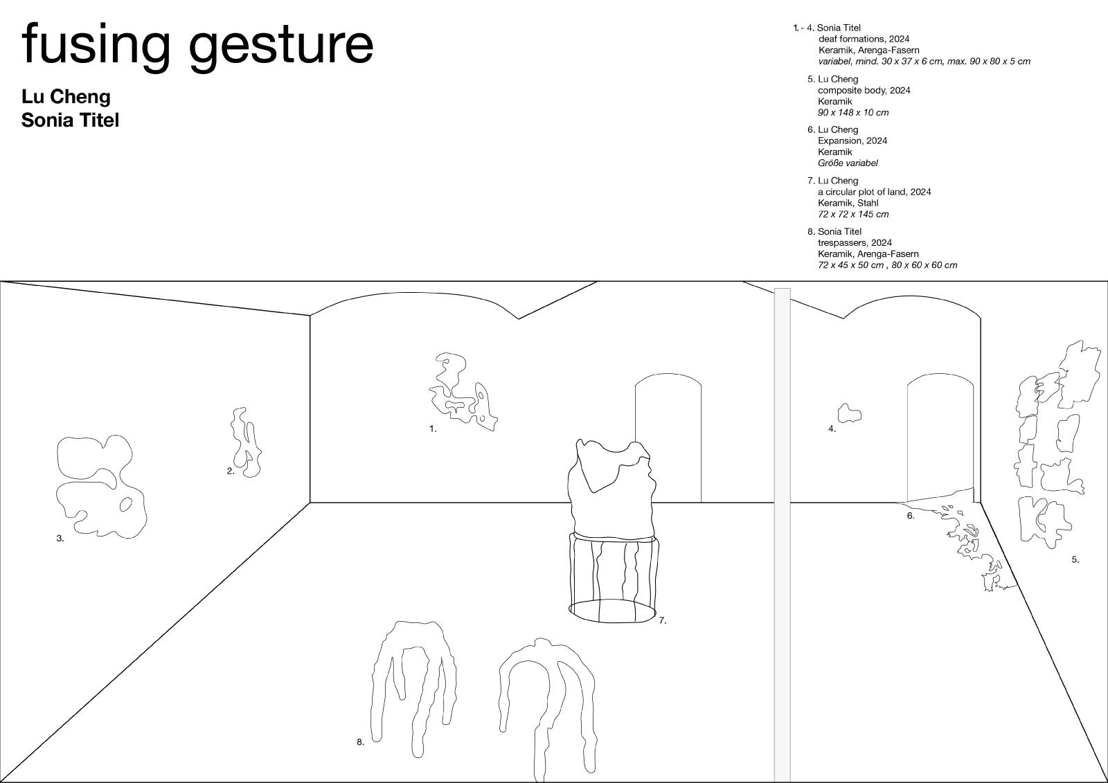 Die ausgestellten Werke zeugen von einem Spiel mit hybriden Körperformen und erzählen in ihrer materiellen Eigenschaft von der Transformation organischer Materie zu anorganischer. Chengs keramische Skulpturen bestehen aus unzähligen, sorgfältig geformten und zu biomorphen Kompositionen zusammengefügten Stacheln. Durch den dynamischen Charakter der Gebilde wirken die Werke wie Momentaufnahmen eines endlosen Wachstumsprozess, die die Essenz der Bewegung in einem Zustand der Ruhe einfangen. Die skulpturalen Arbeiten von Titel ergänzen diese Verschmelzung von Geste und Form. In ihrem Werk verschwimmen die Grenzen zwischen menschlichen und nicht-menschlichen Formen. Die beinartigen Strukturen und haarähnlichen Auswüchse verleihen Titels Skulpturen eine anthropomorphe Präsenz, die sich in einer lebendigen, fast beweglichen Qualität der Arbeiten manifestiert.