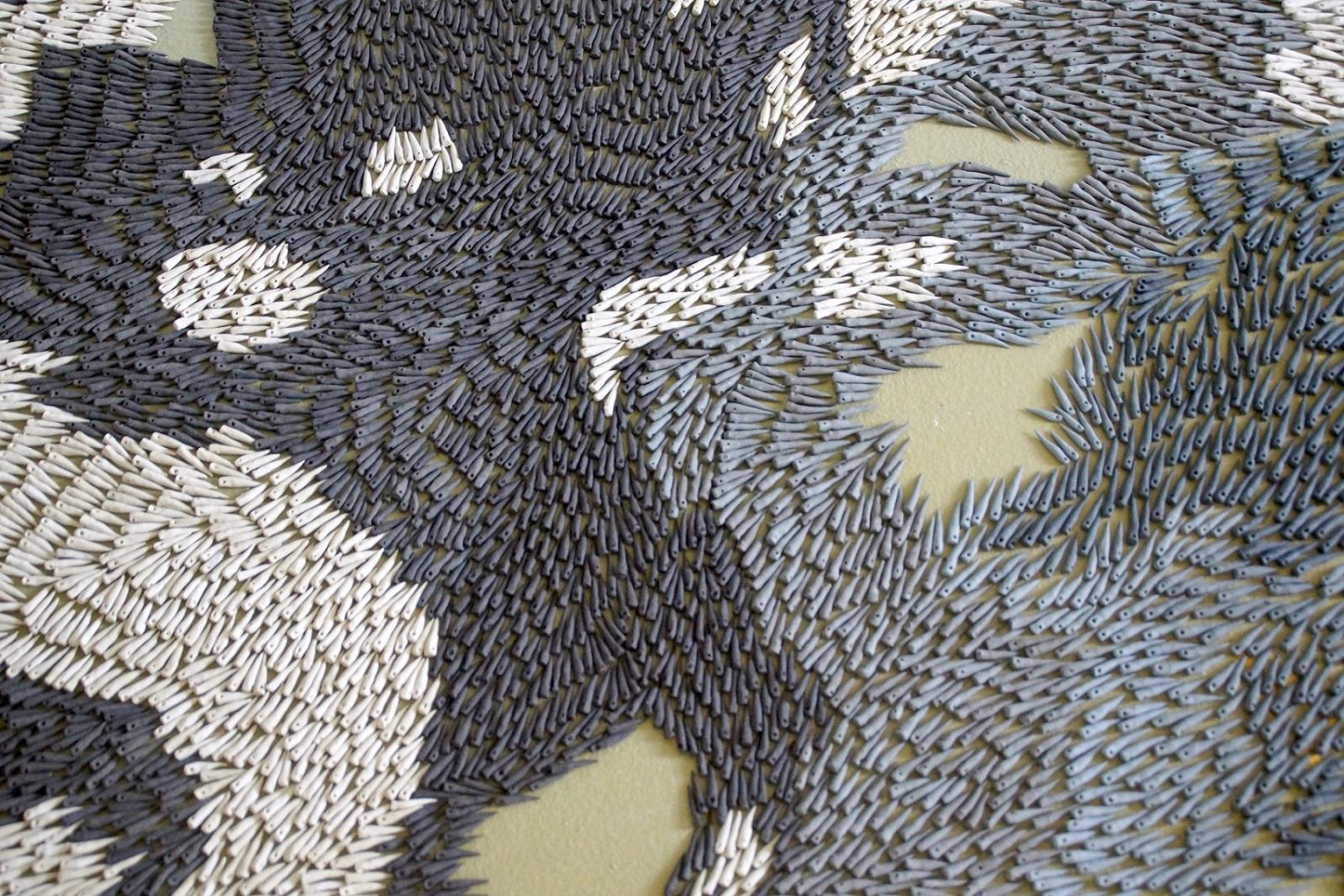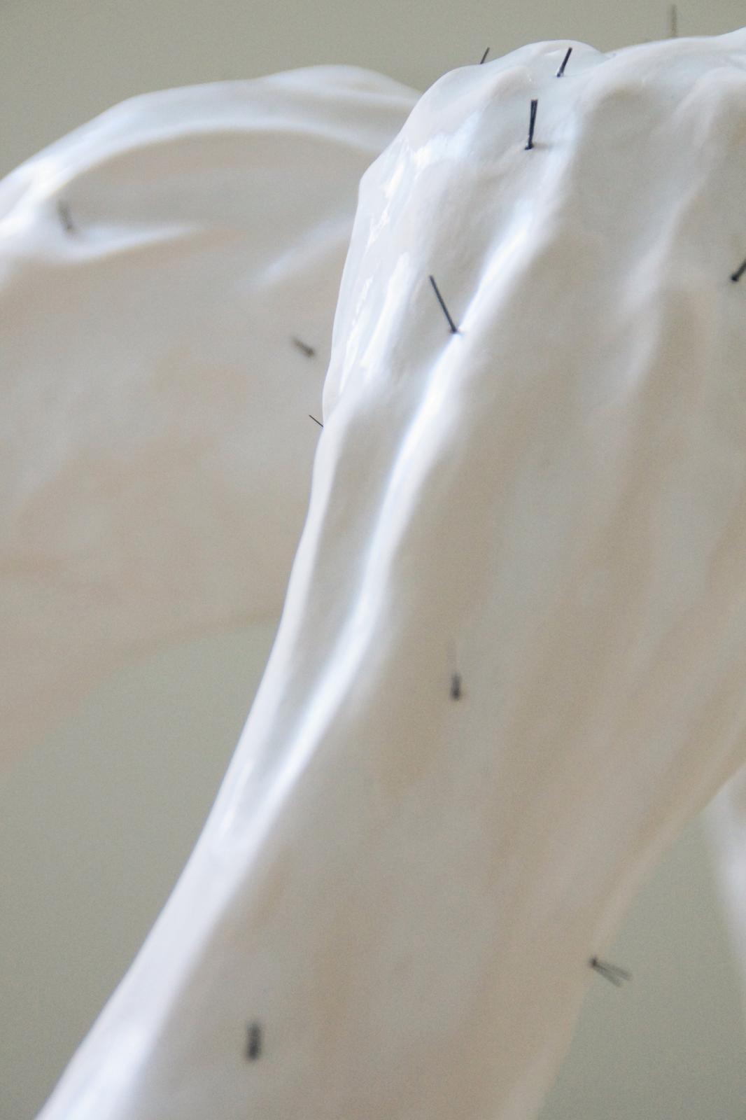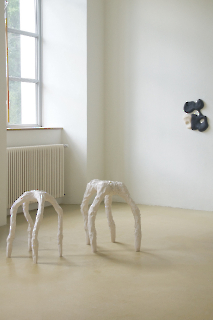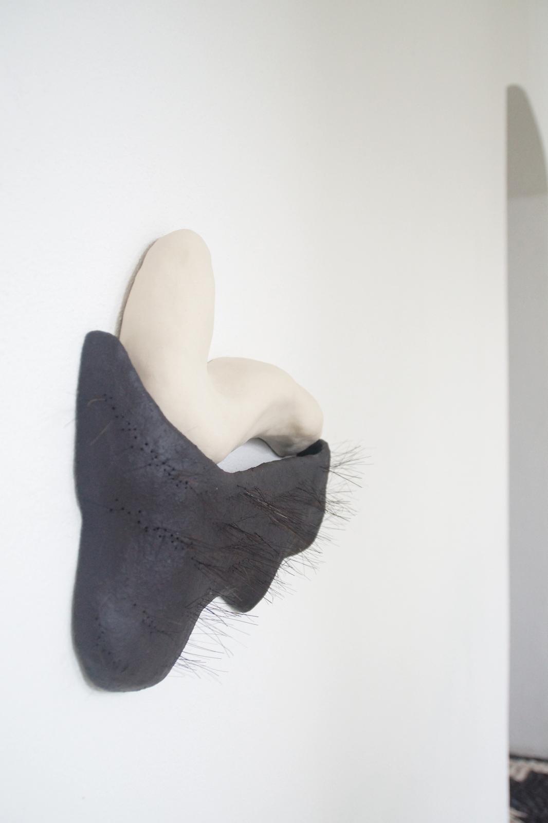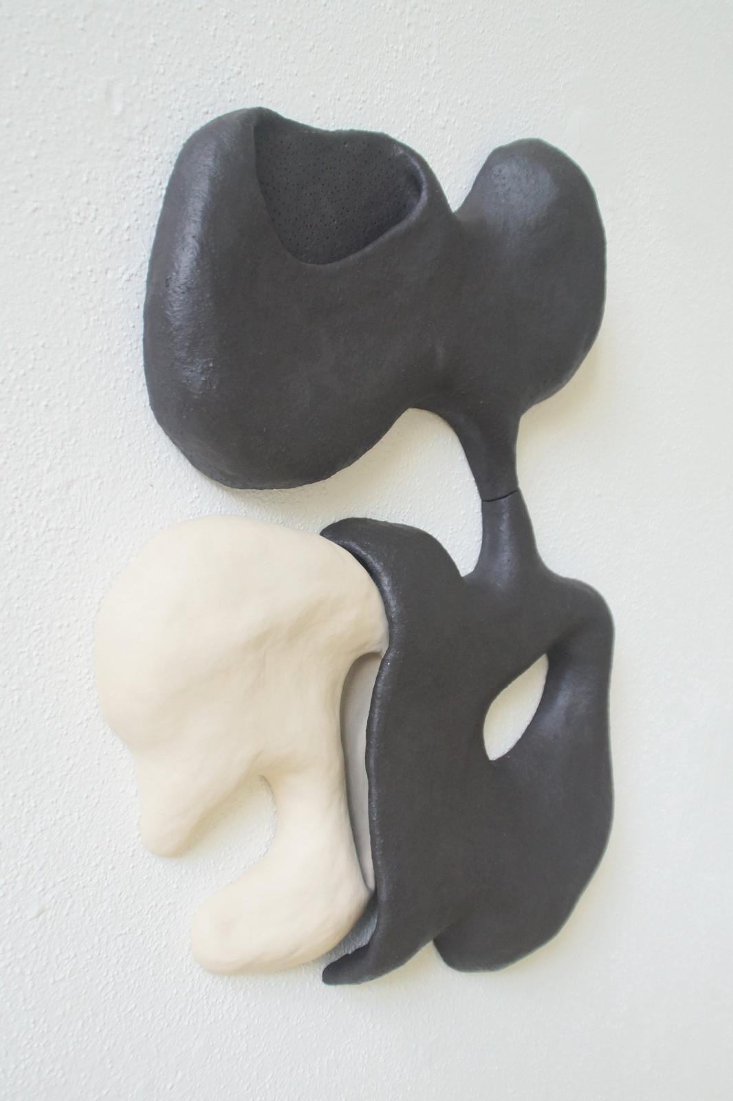 Die ausgestellten Werke zeugen von einem Spiel mit hybriden Körperformen und erzählen in ihrer materiellen Eigenschaft von der Transformation organischer Materie zu anorganischer. Chengs keramische Skulpturen bestehen aus unzähligen, sorgfältig geformten und zu biomorphen Kompositionen zusammengefügten Stacheln. Durch den dynamischen Charakter der Gebilde wirken die Werke wie Momentaufnahmen eines endlosen Wachstumsprozess, die die Essenz der Bewegung in einem Zustand der Ruhe einfangen. Die skulpturalen Arbeiten von Titel ergänzen diese Verschmelzung von Geste und Form. In ihrem Werk verschwimmen die Grenzen zwischen menschlichen und nicht-menschlichen Formen. Die beinartigen Strukturen und haarähnlichen Auswüchse verleihen Titels Skulpturen eine anthropomorphe Präsenz, die sich in einer lebendigen, fast beweglichen Qualität der Arbeiten manifestiert.